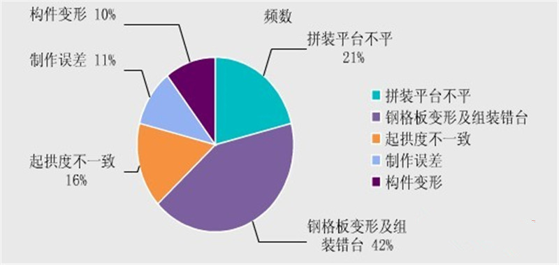 如何提高鋼格柵安裝精度,盡量減少鋼格柵施工質量通病,通過對鋼格柵施工中存在的問題進行調查并整理,希望各施工單位能夠根據常見施工質量問題,舉一反三,查找存在的質量問題并及時修改,制定相關的預防措施。通過大量的統計數據顯示,鋼格柵變形及拼裝平臺不平整是影響鋼格柵安裝平整度主要的原因,所占比例高達60%以上。影響鋼格柵安裝精度原因主要有以下幾個方面,看下圖。